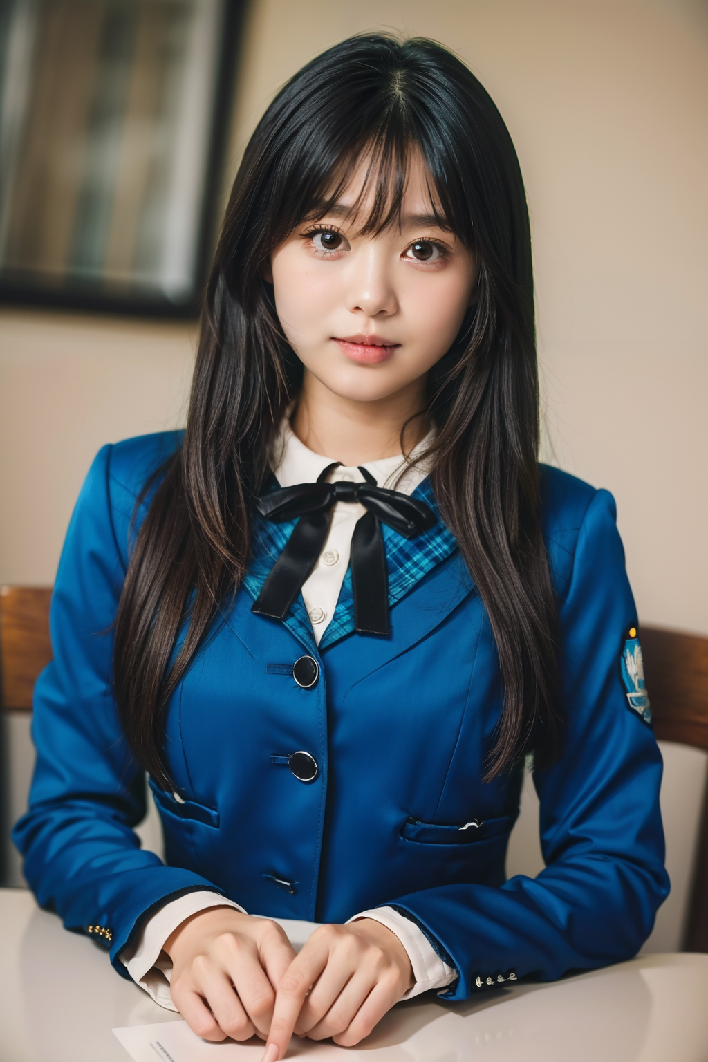 masterpiece,intricate,upper body,depth of field,best quality,1girl,solo,plump,smile,asian,white skin,21y.o,beautiful,black hair,medium hair,looking into viewer,(wearing 12th single hinatazaka46 seifuku:1.3),black ribbon,blue blazer,long sleeves,plaid,collared shirt,uniform,from front,<lora:Hinatazaka46_12th_Single_Seifuku:0.8>,indoor,cafeteria,, RAW photo, subject, (high detailed skin:1.2), 8k uhd, dslr,soft lighting,high quality, film grain, Fujifilm XT3, <lora:epiNoiseoffset_v2-pynoise:1>, highres,huge filesize,HD,highest quality,best quality,highly detailed hair,proportional body,proportional breasts,beautiful breasts,highly detailed skin,goosebumps,visible pores,intricate,masterpiece,ultra high res,photorealistic,depth of field,RAW photo,best quality,realistic,photo-realistic,an extremely delicate and beautiful,CG,finely detail,absurdres,, <lora:add_detail:0.5>,add_detail