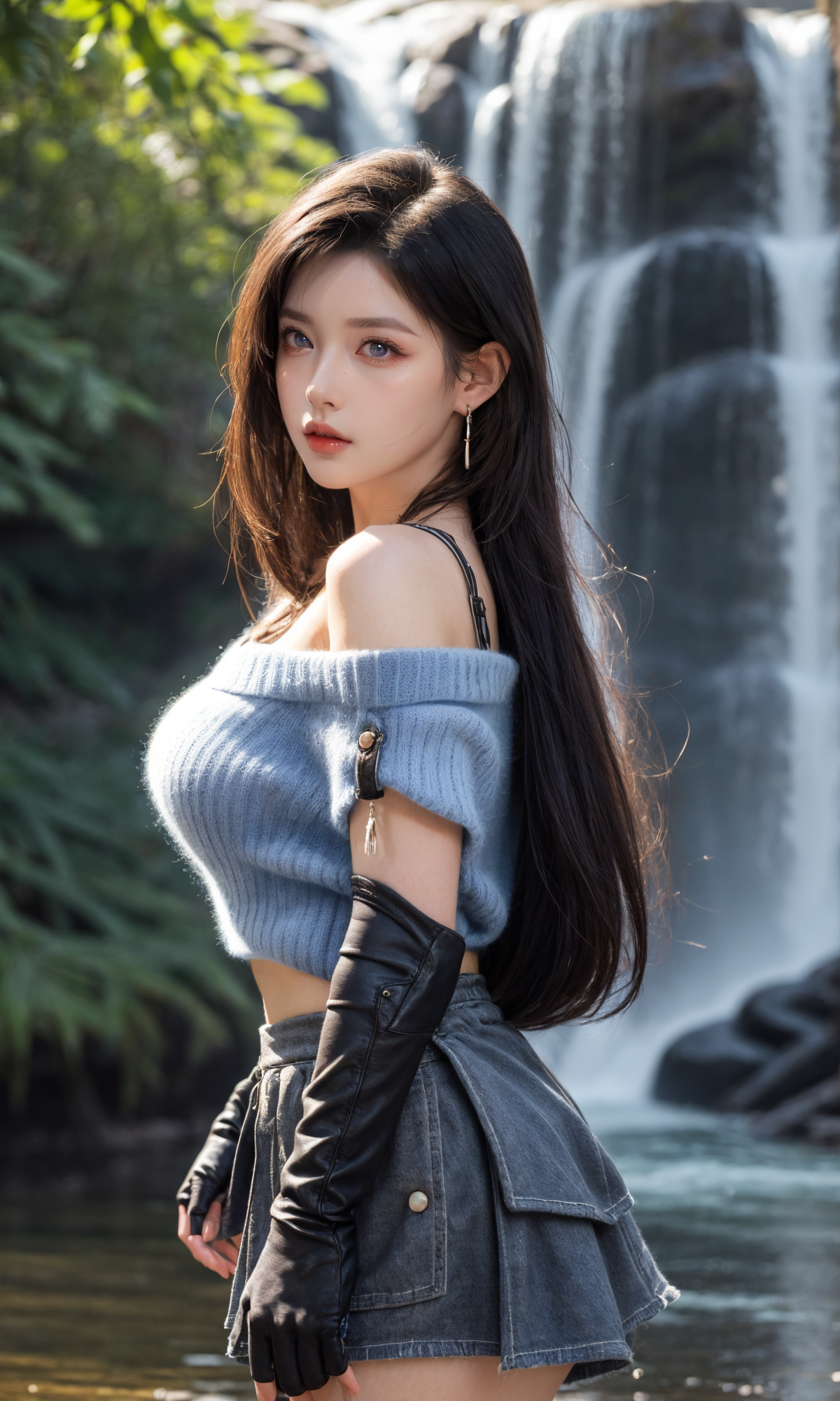 (Best Quality, Masterpiece:1.4), (Realism:1.2), (Realisitc:1.2), (Absurdres:1.2), (photorealistic:1.3), Realistic Skin,Solo,( Very Big Eyes,beautiful detailed eyes, symmetric eyes,), ((cowboy shot)),1girl,solo, looking at viewer,blur, depth of field, outdoors, ((mountain, waterfall)), full body, <lora:tifa-nvwls-v2:0.9> metTifa, red eyes, low-tied long hair, earrings, cropped sweater, blue sweater, off-shoulder, short sleeves, suspender skirt, black elbow gloves, armored legwear, large breasts, <lora:add_detail:0.55>, standing,
