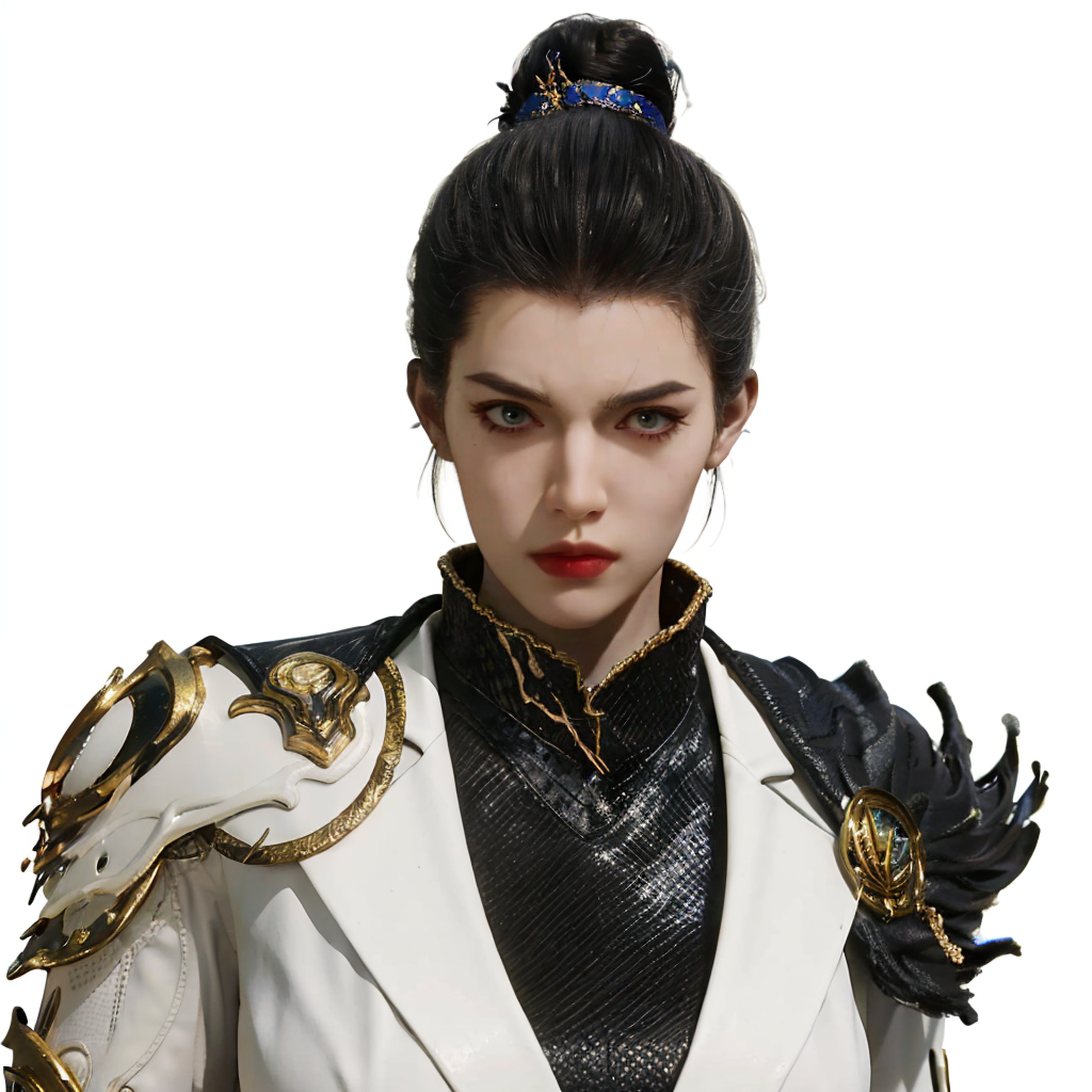1girl,solo,big eyes,forehead,red lips,serious,angry,black hair,(single hair bun),hair ornament,(armor:1.2),(looking at viewer),(stare),(white background),3d,game cg,(Cinematic Lighting),(skin gloss),(perfect skin),Highly detailed,(ultra-detailed),hatching \(texture\),(8k,best quality,huge filesize,masterpiece:1.5),<lora:斗罗大陆2-仙琳儿:0.65>