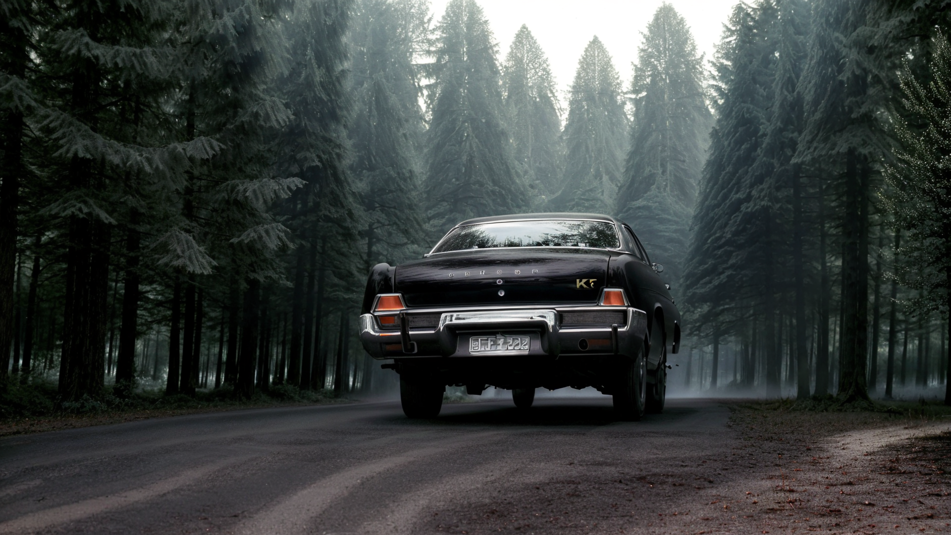 motor vehicle,ground vehicle,car,nature,scenery,sky,cloud,road,tree,forest,(retro style),(high contrast:1.5),(dark tones:1.5),(no humans),(outdoors),(realistic),Highly detailed,(ultra-detailed),(8k,best quality,huge filesize,masterpiece:1.5),