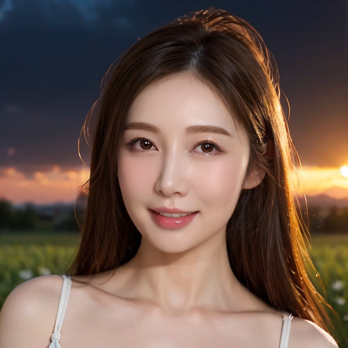 1girl,solo,big eyes,forehead,lips,sky,cloudy sky,(nature),(sunlight),(dusk:1.4),(pink flower),field,(outdoors),(realistic),(Cinematic Lighting),(skin gloss),(perfect skin),Highly detailed,(ultra-detailed),hatching \(texture\),(8k,best quality,huge filesize,masterpiece:1.5),<lora:JAV-Aki-佐々木Oき:0.6>,brown hair,brown eyes,smile,teeth,mature,portrait,