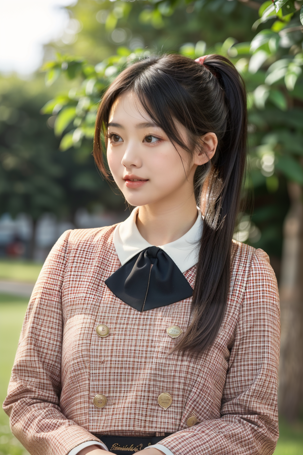 masterpiece,intricate,cinematic light,(upper body:1.2),depth of field,best quality,1girl,solo,plump,smile,asian,white skin,25y.o,beautiful,black hair,looking away,(short ponytail:1.3),(from front:1.2),(wearing hinatazaka46 2nd album seifuku:1.3),ascot,buttons,collared shirt,long sleeves,plaid dress,uniform,in spring,day,nature,on a hill,outdoors,<lora:Hinatazaka46_2nd_Album_Uniform:0.8>,, RAW photo, subject, (high detailed skin:1.2), 8k uhd, dslr,soft lighting,high quality, film grain, Fujifilm XT3, <lora:epiNoiseoffset_v2-pynoise:1>, highres,huge filesize,HD,highest quality,best quality,highly detailed hair,proportional body,proportional breasts,beautiful breasts,highly detailed skin,goosebumps,visible pores,intricate,masterpiece,ultra high res,photorealistic,depth of field,RAW photo,best quality,realistic,photo-realistic,an extremely delicate and beautiful,CG,finely detail,absurdres,, <lora:add_detail:0.5>,add_detail