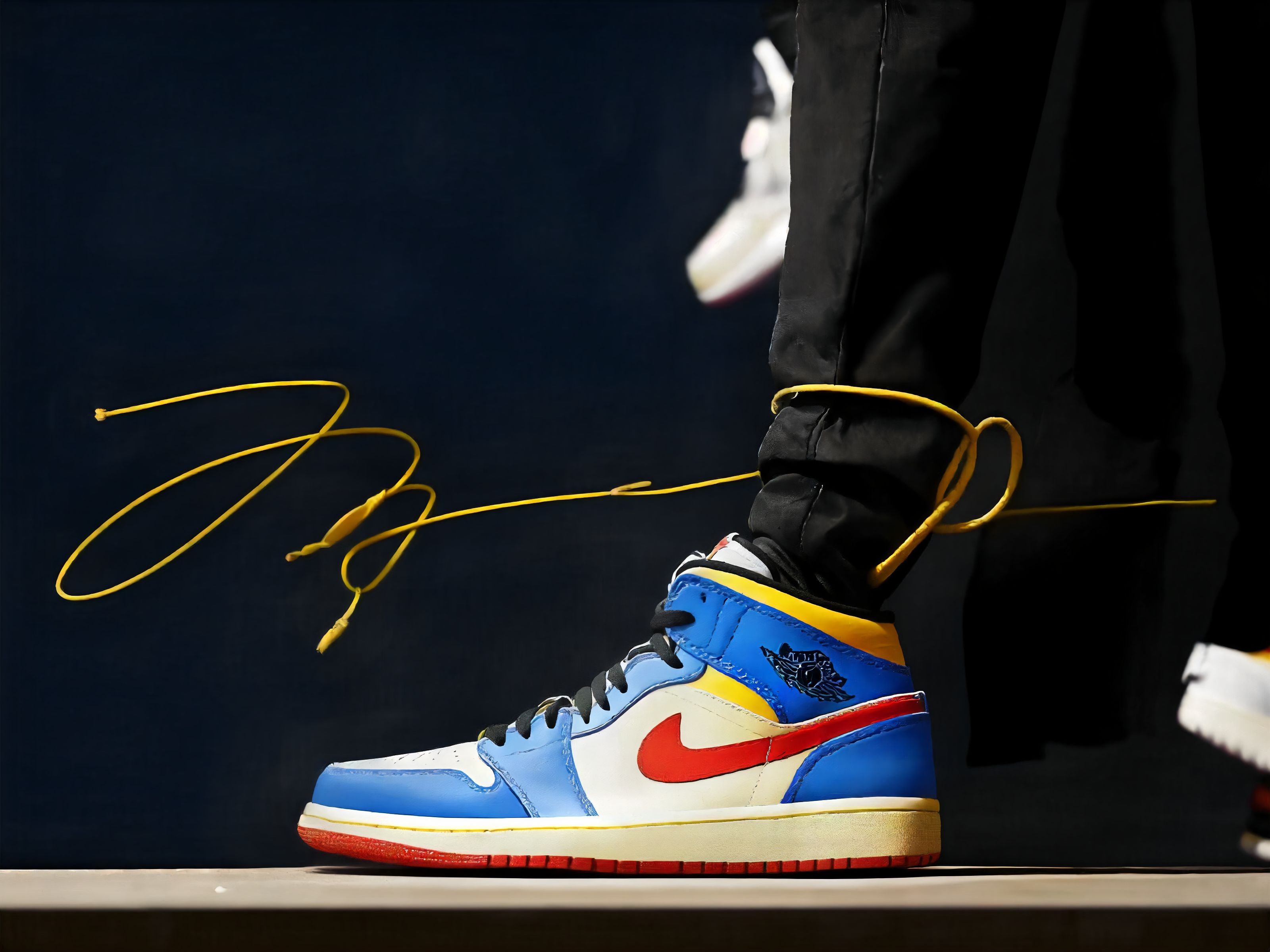 1 pair of nike Air Jordan 1 Mid Fearless Maison Château Rouge, hanging by the laces, caricature, background with basketball and paint running down the side, michael jordan signature, colors blue yellow, artist, highly detailed digital painting, graffiti art, funk art
