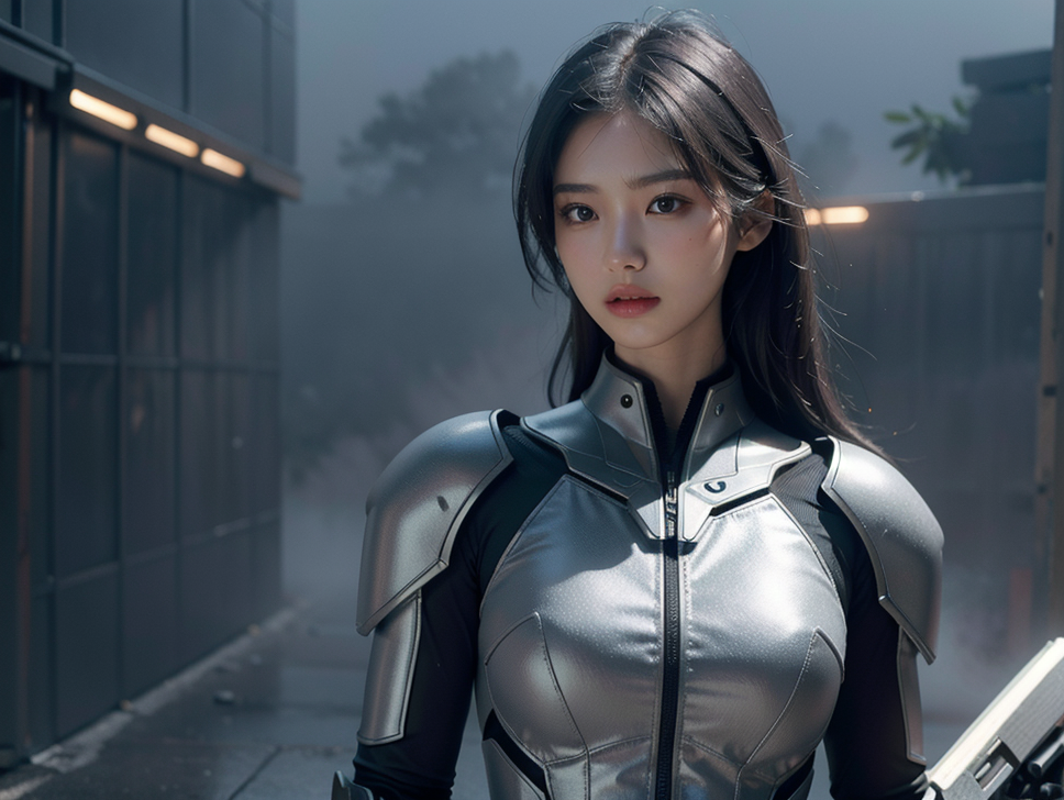 outdoor, ((upper body)), ((( wearing gray and black nano-suits)))+++, (wide hip:0.7, large breasts:0.8, perfect slender young girl body) ,Perfectly glossy skin ,25 yo mature girl, , picture of a vivid, (masterpiece:1.2),(extremely detailed),(8k:1.1),(perfect lighting,best quality,highres,original),(realistic photography:1.4) ,high detailed skin,shaded face, soft lighting, (small face),RAW, ultra highres, pores visible, , shiny_and_glossy_skin, asian beauty, (gorgeous beautiful 20 years old asian girl), ((best detailed slender body)), (asian idol, asian beauty, asian mixed), (complex, Machine background ,spaceship outdoors background, Mecha Transport parts:1.2), (dark and foggy environment:1.1), ((heavy fog environment:1.1)), (battlefield behind:1.2), <lora:JapaneseDollLikeness_v15:0.3>