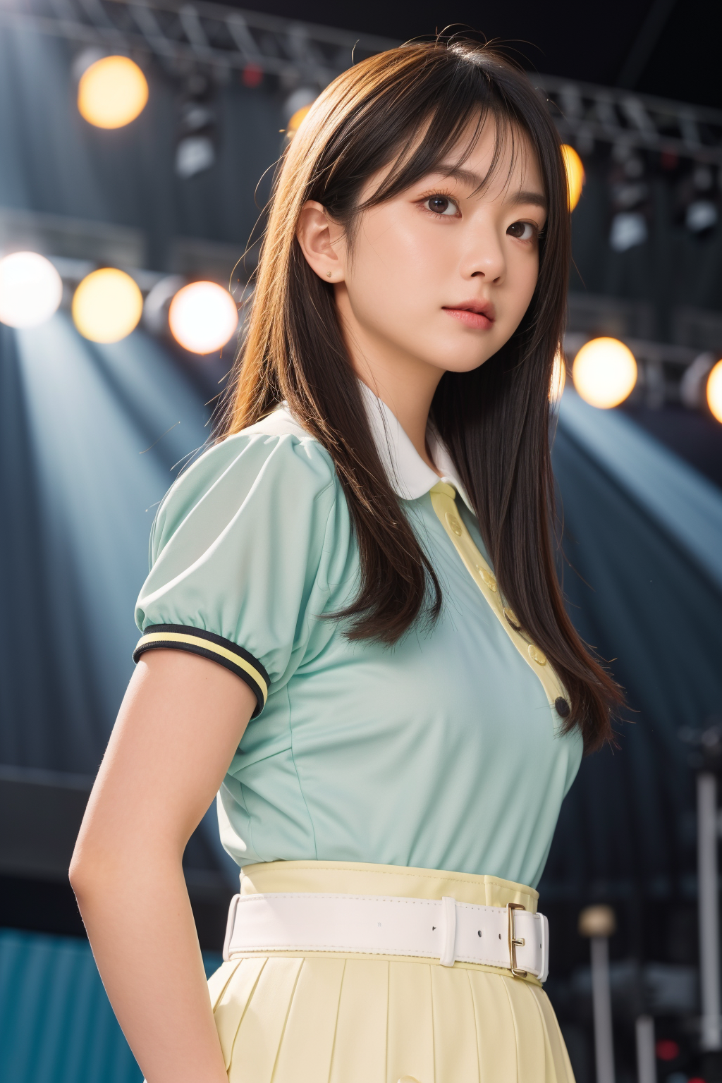 masterpiece,intricate,depth of field,best quality,1girl,solo,plump,smile,asian,white skin,21y.o,beautiful,looking into viewer,(cinematic light:1.2),(portrait:1.2),(upper body:1.3),idol,(stage:1.7),(aqua blue neon light:1.2),(giant stage:1.1),(tokyo dome:1.3),straight hair,light brown hair,swept bangs,medium hair,head tilt,small breasts,<lora:Hinatazaka46_10th_Single_Uniform:0.7>,(wearing hinatazaka46 10th single uniform:1.4),olive green shirt,white collar,(white belt:1.3),(white buttons:1.3),(yellow pleated skirt:1.3),emblem,from front,(3/4 view:1.5),, RAW photo, subject, (high detailed skin:1.2), 8k uhd, dslr,soft lighting,high quality, film grain, Fujifilm XT3, <lora:epiNoiseoffset_v2-pynoise:1>, highres,huge filesize,HD,highest quality,best quality,highly detailed hair,proportional body,proportional breasts,beautiful breasts,highly detailed skin,goosebumps,visible pores,intricate,masterpiece,ultra high res,photorealistic,depth of field,RAW photo,best quality,realistic,photo-realistic,an extremely delicate and beautiful,CG,finely detail,absurdres,, <lora:add_detail:0.5>,add_detail