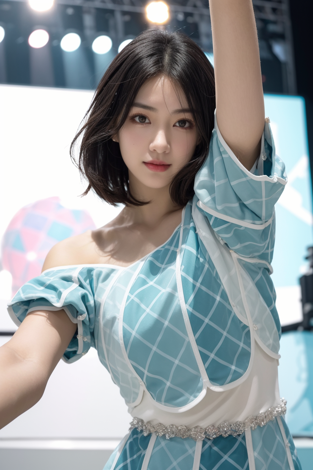 masterpiece,intricate,depth of field,best quality,1girl,solo,plump,smile,asian,white skin,21y.o,beautiful,black hair,(medium hair:1.4),looking into viewer,(wearing hinatazaka46 11th single live perform costume:1.3),(aqua dress:1.2),(argyle:1.2),(short sleeves:1.2),(from front:1.3),jewelry,collarbone,bracelet,lace,bare shoulders,sandals,<lora:Hinatazaka46_11th_Single_Live_Perform_Costume:0.8>,(day:1.1),(cinematic light:1.2),(portrait:1.2),(upper body:1.3),idol,(stage:1.5),(aqua blue neon light:1.2),(dancing:1.5),(giant stage:1.1),(tokyo dome:1.3),, RAW photo, subject, (high detailed skin:1.2), 8k uhd, dslr,soft lighting,high quality, film grain, Fujifilm XT3, <lora:epiNoiseoffset_v2-pynoise:1>, highres,huge filesize,HD,highest quality,best quality,highly detailed hair,proportional body,proportional breasts,beautiful breasts,highly detailed skin,goosebumps,visible pores,intricate,masterpiece,ultra high res,photorealistic,depth of field,RAW photo,best quality,realistic,photo-realistic,an extremely delicate and beautiful,CG,finely detail,absurdres,, <lora:add_detail:0.5>,add_detail