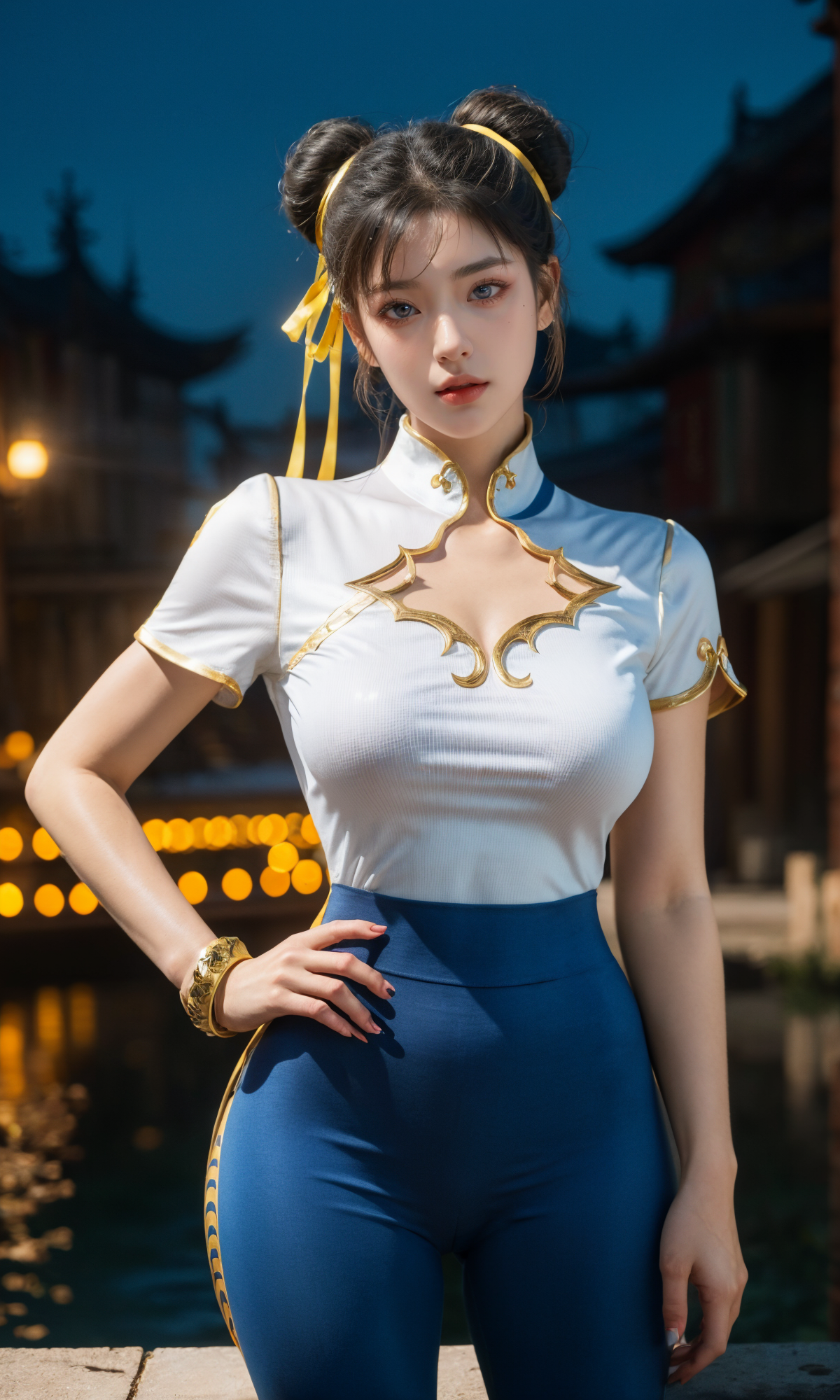 (Best Quality, Masterpiece:1.4), (Realism:1.2), (Realisitc:1.2), (Absurdres:1.2), (photorealistic:1.3), Realistic Skin,Solo,( Very Big Eyes,beautiful detailed eyes, symmetric eyes,), ((cowboy shot)),1girl,solo, (contrapposto, hand on hip)<lora:GAME_StreetFighter_ChunLi_ownwaifu:0.8>, WhiteDress_ChunLi_ownwaifu, 1girl, chun-li, brown hair, brown eyes, large breasts, red eyeshadow, hair bun, double bun, hair ribbon, makeup, large breasts, (thick thighs), muscular female, toned, bangs, lipstick, eyeliner, wide hips, white dress, tight pants, blue pants, china dress, chinese clothes, bracelet, short sleeves, cleavage cutout, yellow ribbon, pelvic curtain, gold trim, skin tight, canal, vanishing point, depth_of_field, scenery, night, bloom, aerial fireworks, solo, cowboy shot, looking at viewer, <lora:add_detail:0.3>, standing,