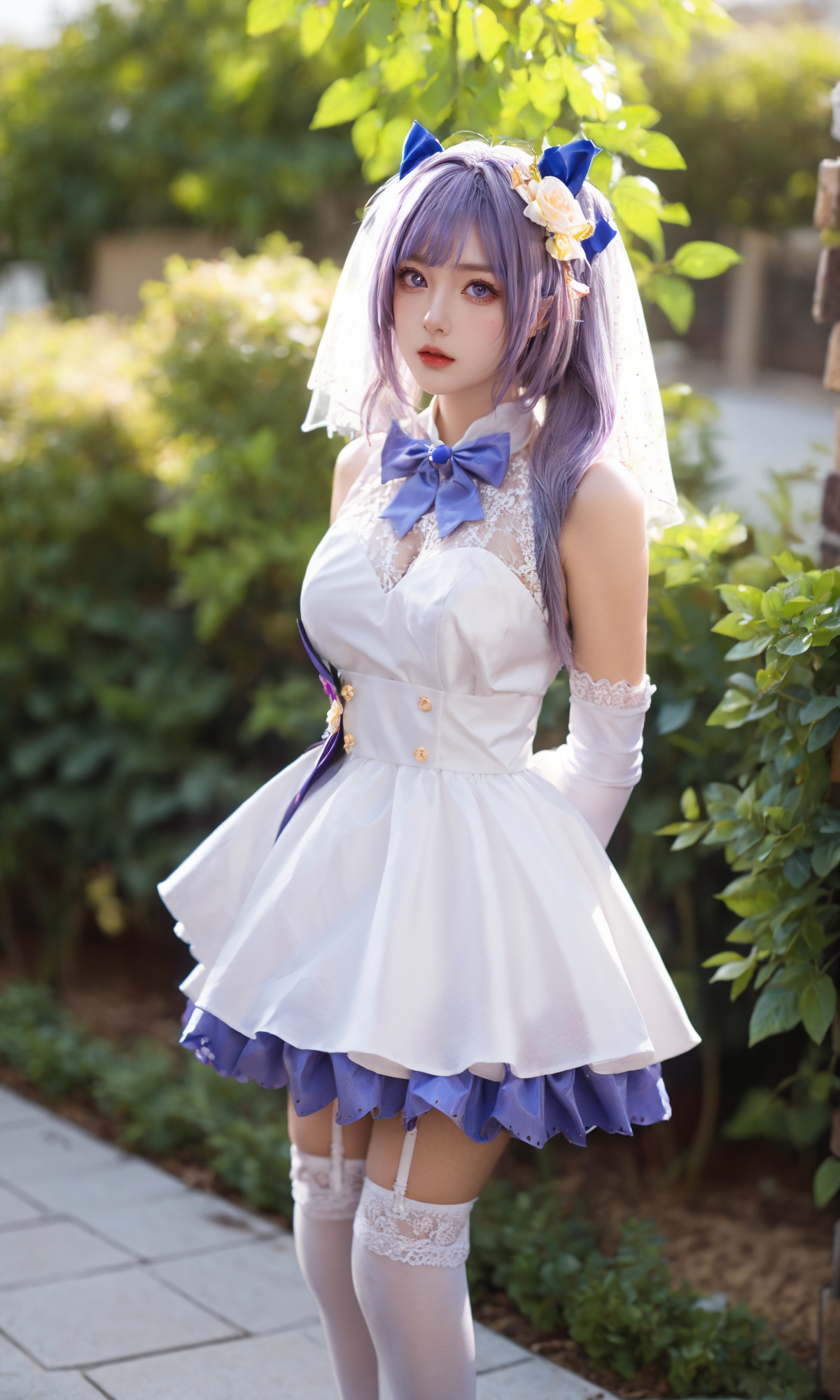 (Best Quality, Masterpiece:1.4), (Realism:1.2), (Realisitc:1.2), (Absurdres:1.2), (photorealistic:1.3), Realistic Skin,Solo,( Very Big Eyes,beautiful detailed eyes, symmetric eyes,), 1girl,solo,<lora:add_detail:0.3>, ((arms behind back, cowboy shot, huge breasts, cleavage)), standing, full body, keqing cosplay costume, keqing, cosplay, alternate costume, purple hair, twintails, long hair, hair bun, cone hair bun, dress, white dress, wedding dress, sleeveless dress, frills, lace trim, gloves, white gloves, elbow gloves, bow, bowtie, flower, veil, bridal veil, bride, hair ornament, hair flower, hair ribbon, hair bow, thighhighs, lace-trimmed legwear, frilled thighhighs, white thighhighs, high heels, holding bouquet, bouquet, outdoors, garden, tree, depth of field, <lora:Genshin_Keqing_WeddingDress_cosplay_v1:0.75>