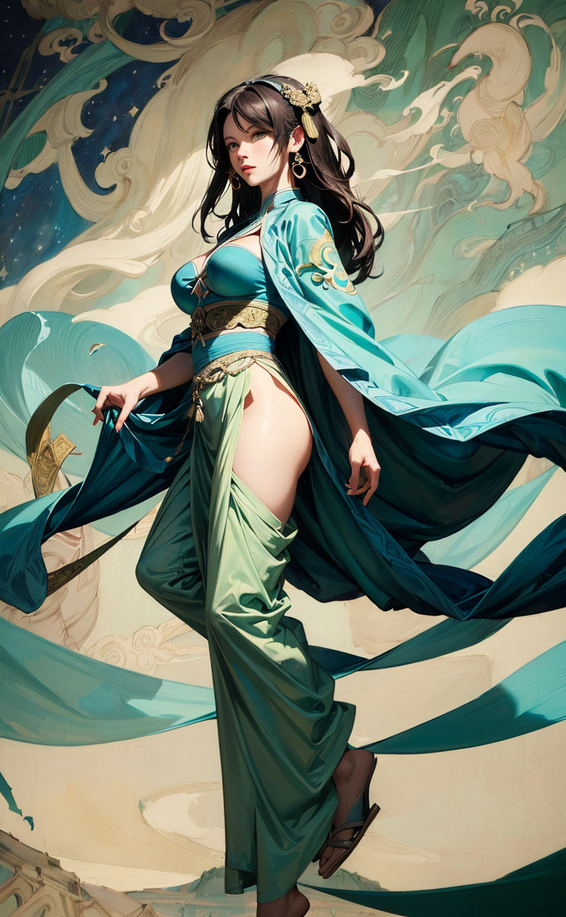 (Green and blue hue:1.6), 1girl, solo, Flying among the clouds, Dunhuang Flying Apsaras costume, (Dunhuang background, mural background:1.6), messy long hair, a lot of smoke, ((realistic, masterpiece, movie lighting, best quality)), Beautiful lighting among background, floating colorful sparkles, the most beautiful form of chaos, elegant, a brutalist designed, vivid colours, ((full body)), (dynamic angle:1.4), illustration, chiaroscuro, god rays, romanticism, best quality, zhongfenghua, <lora:dunhuang_20230625021029:0.8> <lora:detail_slider_v4:1.6> <lora:zhongfenghuaxiyou:0.4>,<lora:add_detail:0.55>,solo,