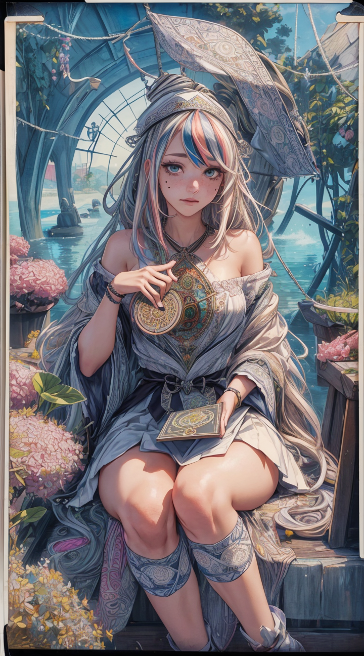 official art,unity 8k wallpaper,ultra detailed,beautiful and aesthetic,beautiful,masterpiece,best quality,(zentangle, mandala, tangle, entangle),1girl,mature_female,poet,backwards_hat,silver hair,((streaked hair:1.1)),(hime cut:1.1),(mole_under_eye:1.1),(disgust:1.3),(top-down_bottom-up:1.1),incredibly absurdres,(book:0.9),(Visible stream of note:1.15),(photo_(medium):1.1),(polaroid:1.1),colorful,(solo:1.3),(reality:1.1),water vapor,strong rim light,(Trapeze:1.2),<lora:add_detail:0.7>,