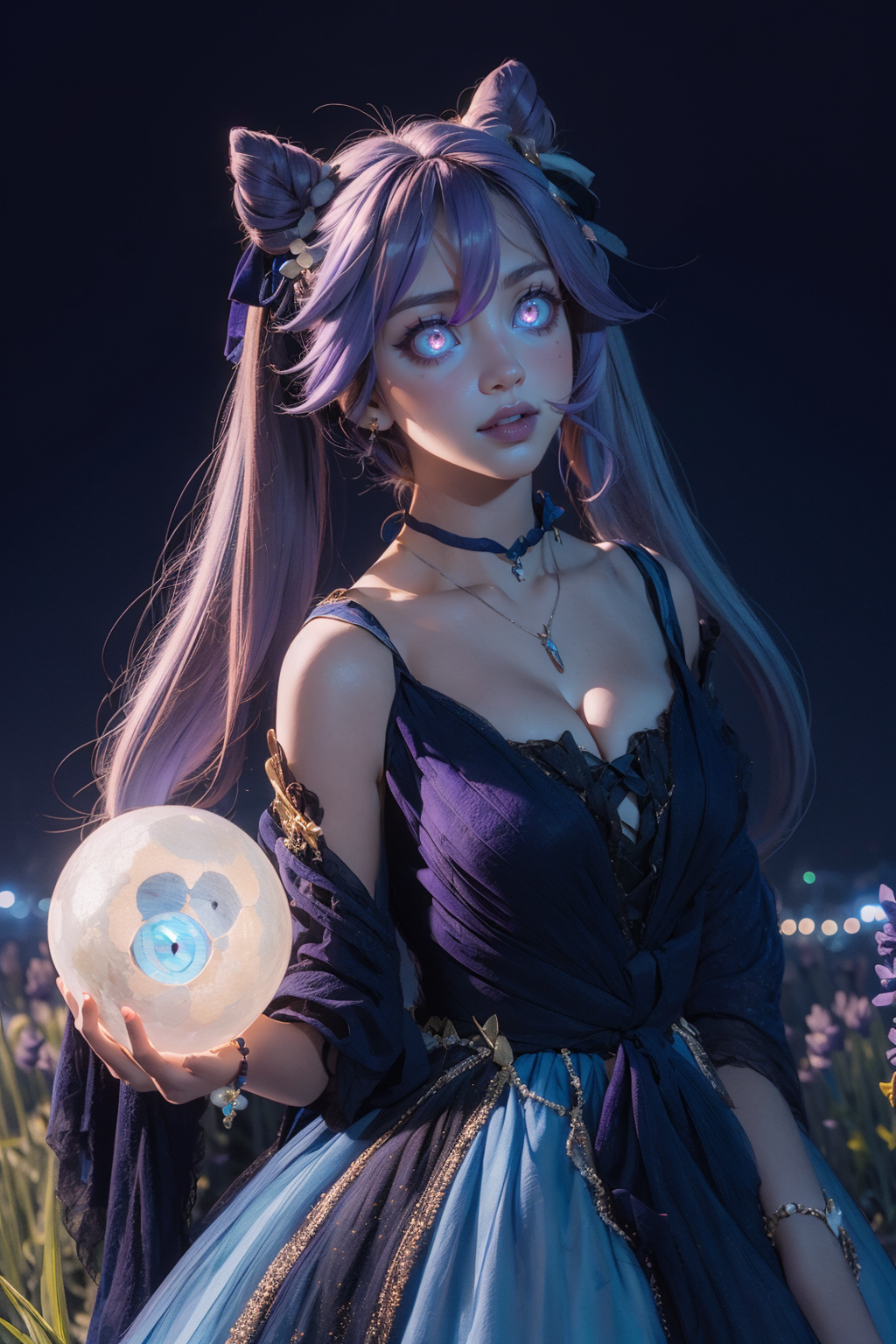 (masterpiece, best quality:1.2),illustration,8k,hd,1 girl,keqingopulent,(lavender hair:1.3),twintails,bangs,hair between eyes,purple eyes,very long hair, cldqz,dress,blue dress,hair ornament,bracelet,jewelry,choker,bracelet,necklace,(night:1.3),(glowing eyes:1.3),large breasts,(cleavage:1.2),