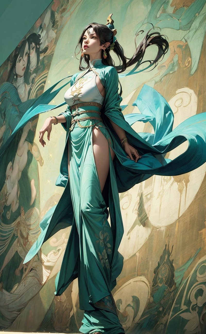 (Green and blue hue:1.6), 1girl, solo, Flying among the clouds, Dunhuang Flying Apsaras costume, (Dunhuang background, mural background:1.6), messy long hair, a lot of smoke, ((realistic, masterpiece, movie lighting, best quality)), Beautiful lighting among background, floating colorful sparkles, the most beautiful form of chaos, elegant, a brutalist designed, vivid colours, ((full body)), (dynamic angle:1.4), illustration, chiaroscuro, god rays, romanticism, best quality, zhongfenghua, <lora:dunhuang_20230625021029:0.8> <lora:detail_slider_v4:1.6> <lora:zhongfenghuaxiyou:0.4>,<lora:add_detail:0.55>,solo,
