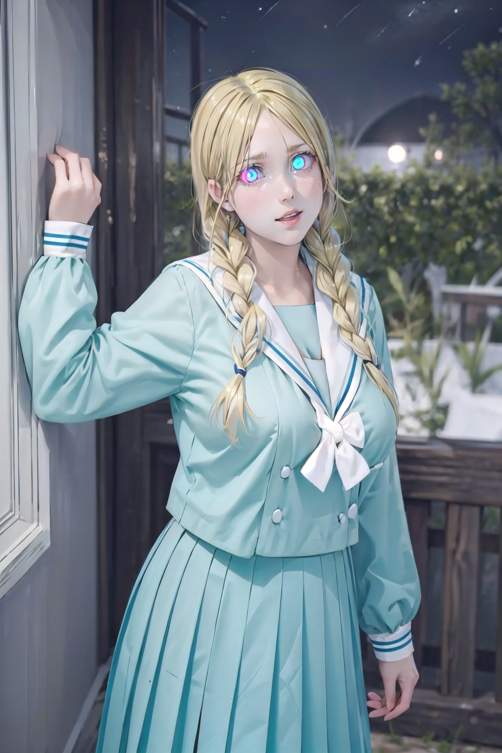 (masterpiece, best quality:1.2),illustration,8k,hd,1girl,solo,depth of field,(blonde hair:1.4),blue eyes,blonde hair,long hair,lhz,school uniform,blue skirt,serafuku,long sleeves,white sailor collar,pleated skirt,(night:1.4),indoors,(glowing eyes:1.4),big breasts,bouncing breasts,(cleavage:1.2),(european princess:1.2),shiny skin,twin braids,
