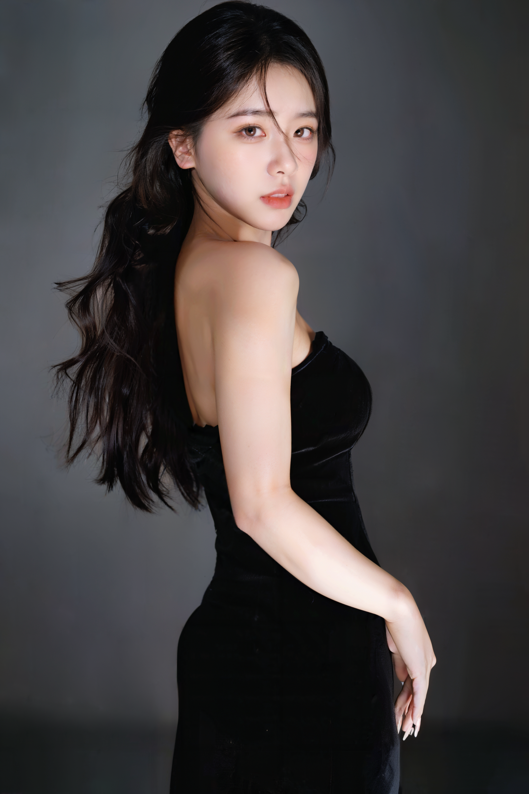 ((asian girl)), ((black skirt, bare shoulder)), view from behind, simple background, grey background, bright theme, ((ultra-detailed)), (highly detailed CG illustration),(expressionless), (best quality:1.2),(1girl:1.2),High quality texture, intricate details, detailed texture, High quality shadow, thin lips, brown eye pupil, depth of field, perspective,20s, (big eyes:1.2),blush,perfect body, lean body, (narrow waist:1.3), large breast, distinct_image, (lustrous skin), solo focus, (brown hair), (streaked hair), ((long hair)), <lora:add_detail:0.5>, <lora:GoodHands-vanilla:1>, <lora:detailed_notrigger:0.7>, <lora:picxer_real:0.7>, <lora:zyd232_ChineseGirl_v4_2:0.6>, <lora:010:0.4>, <lora:FilmVelvia3:0.8>