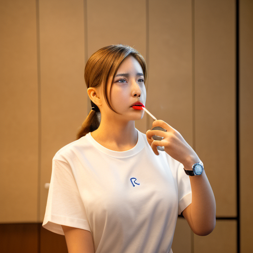 holding cigarette, eyewear on head, white shirt, wristwatch, breasts, 1girl, day, real life insert, blue eyes, ponytail