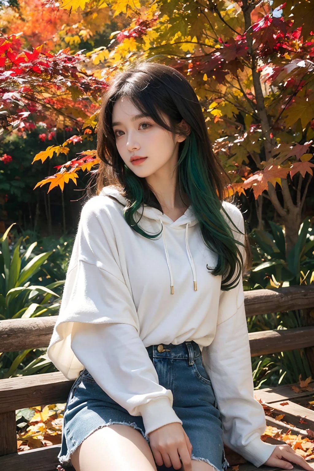light green hair,ahoge,hoodie,stockings,denim_skirt(extremely detailed CG unity 8k wallpaper),(masterpiece),(best quality),(ultra-detailed),(best illustration),(best shadow),(an extremely delicate and beautiful),dynamic angle,finely detail,(bloom),(shine),classic,(painting),cinematic light,extremely delicate and beautiful girls,beautiful detailed eyes,(((divinity))),smile,((only one girl)),(maples),sunlight,beautiful and detailed sky,(maple_forest),(fairyland),(((maple_leaves))),autumn,<lora:MengX girl_Mix_V40:0.7>,, (masterpiece, top quality, best quality, official art, beautiful and aesthetic:1.2), extreme detailed