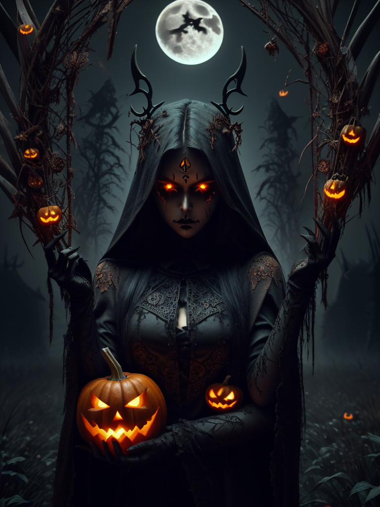Dark Fantasy Art, Dark Moody Atmosphere, A menacing pumpkin-headed woman looms in a moonlit cornfield, wielding a rusted pitchfork. Eerie orange light flickers within its carved grimace. Tattered robes billow in the autumn wind. Mystical runes glow on its straw-stuffed body, evoking ancient harvest rituals., dramatic, mysterious, dark moody atmosphere, dark, moody, dark fantasy style, <lora:HalloweenGlowStyle:0.9> HalloweenGlowStyle,