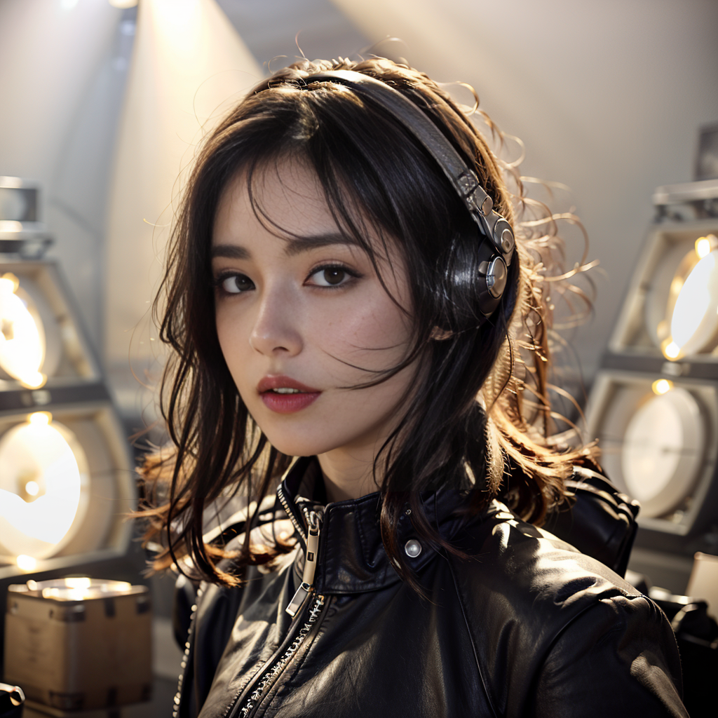 colorful stage light, 1girl wearing leather jacket, high quality, dance club background, realistic, <lora:DJ:1> DJ, passionate