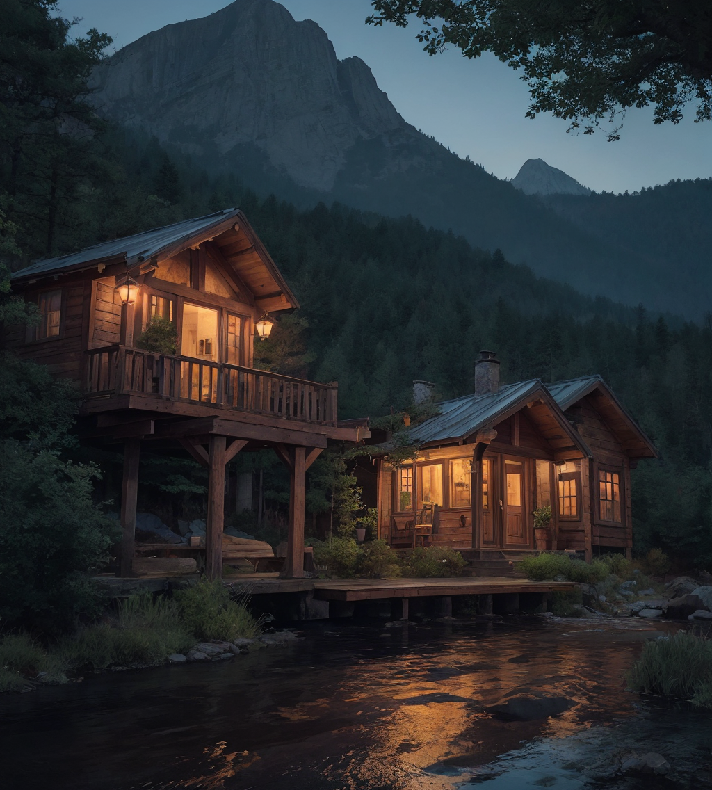 Visual impact,masterpiece,exquisite,amazing details,complex textures,mysterious scenes,late night,mountains,dense forests,(small tech UFOs in perfect colors, landing,) perfect vintage cabins,chimneys,lakeside,small wooden boats,glow,gloss,deep space scenes,8K,always award-winning,<lora:Close_Encounters_Of_The_Third_Kind:0.5>,