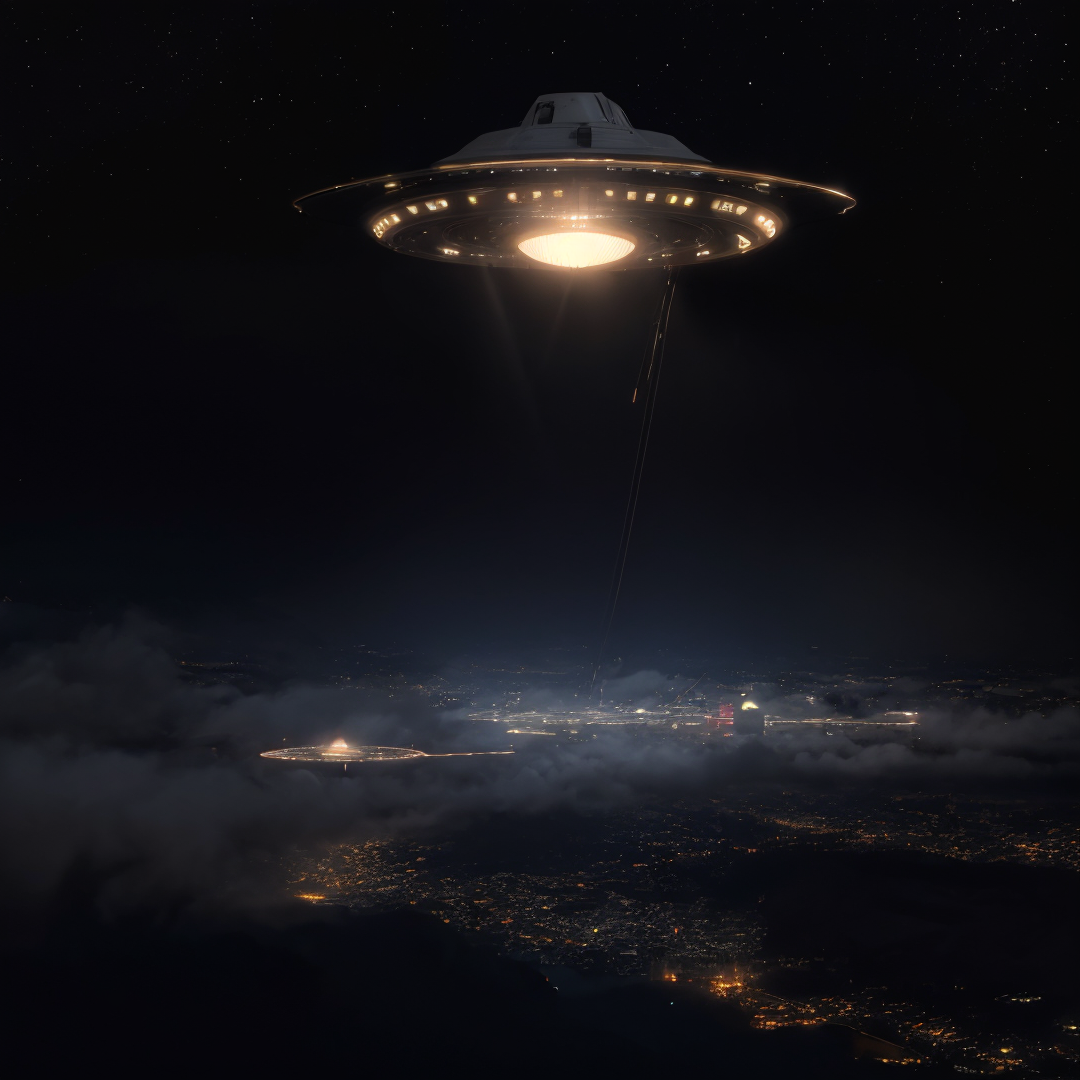 Mysterious scene, late at night, over the city with tall buildings, magnificent, flat unique symmetrical high-tech UFO spotted by searchlight, fog, deep space scene,, highest quality, award-winning, clear, excellent details, fine texture, texture, ultra-realistic, <lora:Close_Encounters_Of_The_Third_Kind:0.3>,