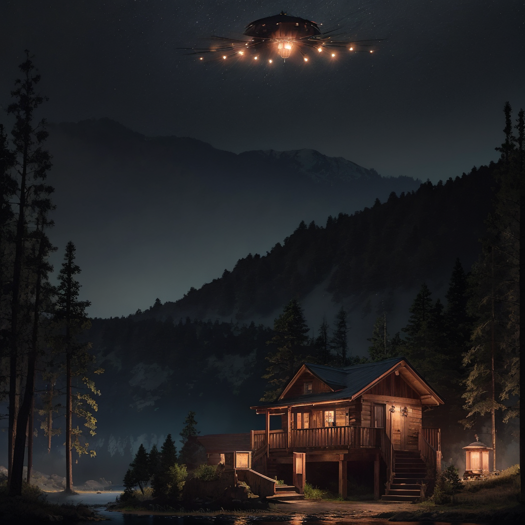 Visual impact,masterpiece,exquisite,amazing details,complex textures,mysterious scenes,late night,mountains,dense forests,(small tech UFO in perfect colors, landing,) perfect vintage cabin,chimney,lakeside,small wooden boat,glow,gloss,deep space scenes,highest quality,clear,ultra-realistic,8K,always award-winning,<lora:Close_Encounters_Of_The_Third_Kind:0.9>,