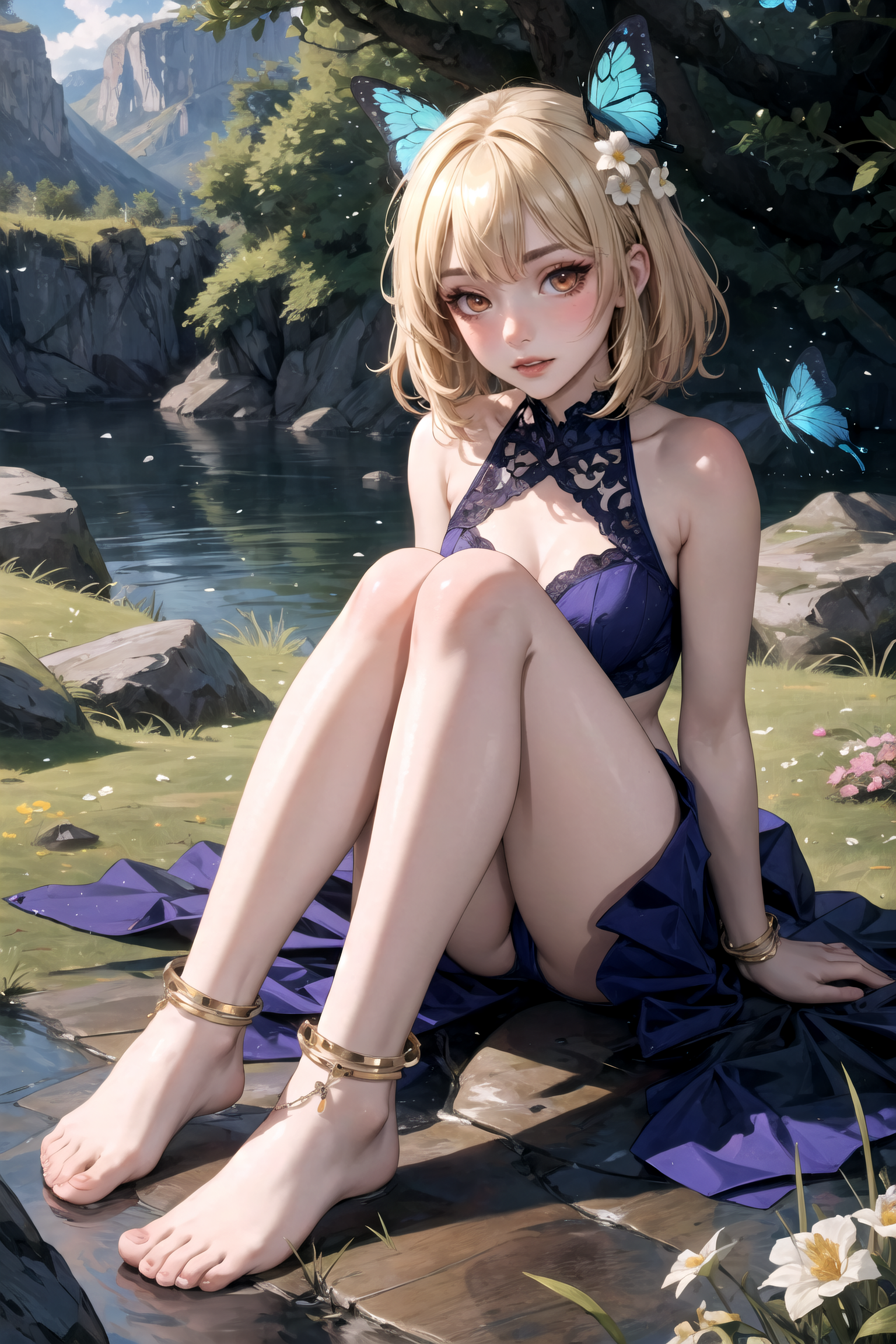 8K, high res, best quality, Highly detailed, masterpiece, UHD, Vivid Colors, Bokeh, extreme detail description, intricate, detailed background. gloss, shiny. 1girl, solo, lively pose, ultra pretty face, tender body, delicate beautiful small feet, slender crus, slim, skinny, pale skin, sitting on the floor, hair flowers, sumptuous anklets, grassland, rock, water, wind, summer. flowers, trees, a pet, fishes, birds, butterfly. <lora:addDetail.JO09:0.5> <lora:LowRA:0.5> <lora:Feet_Focus-DEF:0.5> <lora:eGirlMakeup:0.5>