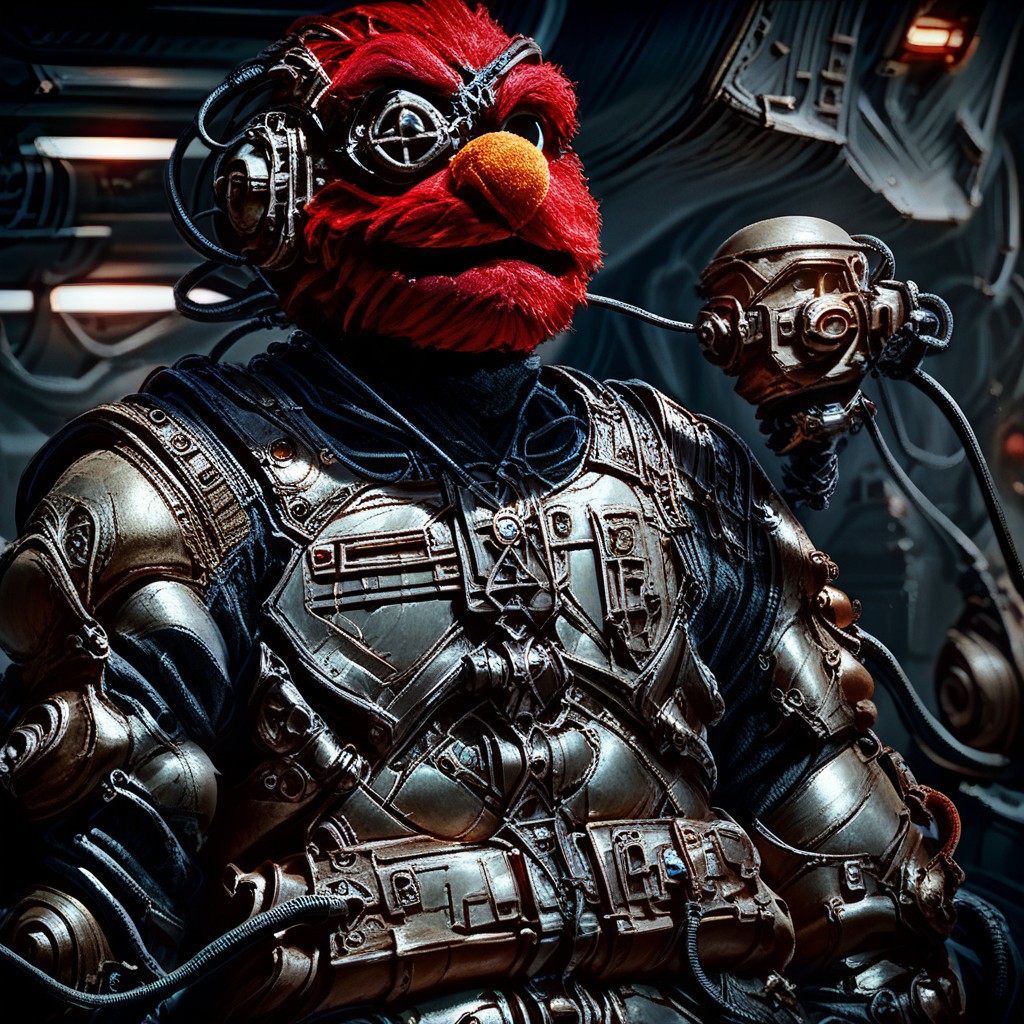score_9, score_8_up, score_7_up, score_6_up, score_5_up, solo, no humans, Elmo, red fur, shaggy fur, Borg, science fiction, cyborg, cable, armor, helmet, weapon, cybernetic, mechanical, laser eyepatch