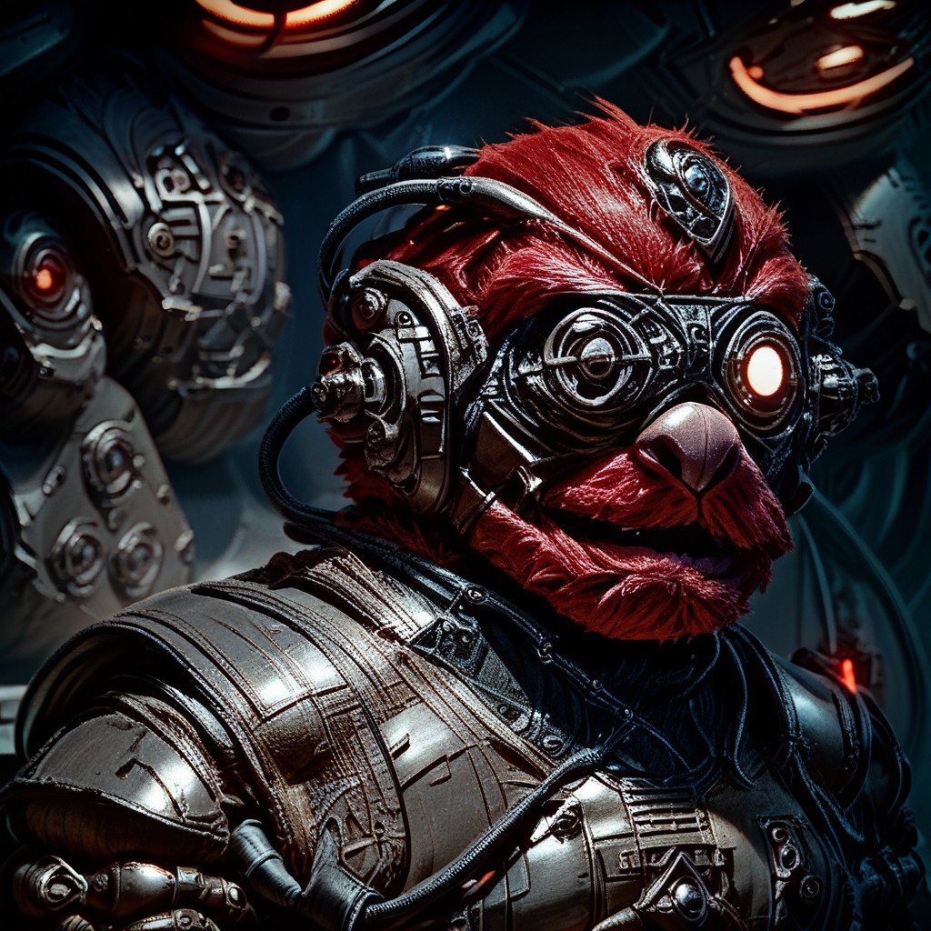 score_9, score_8_up, score_7_up, score_6_up, score_5_up, solo, no humans, Elmo, red fur, shaggy fur, Borg, science fiction, cyborg, cable, armor, helmet, weapon, cybernetic, mechanical, laser eyepatch