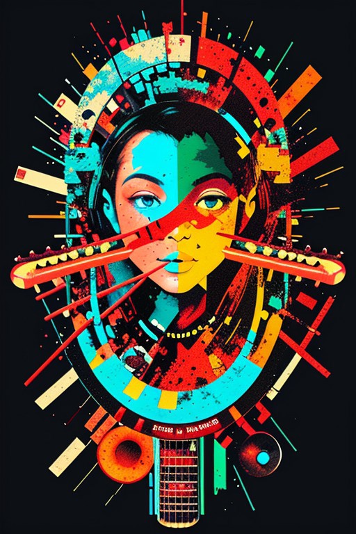 Create a striking abstract collage using vibrant cutout images of musical instruments. Blend them together in an unusual way with glitch effects.