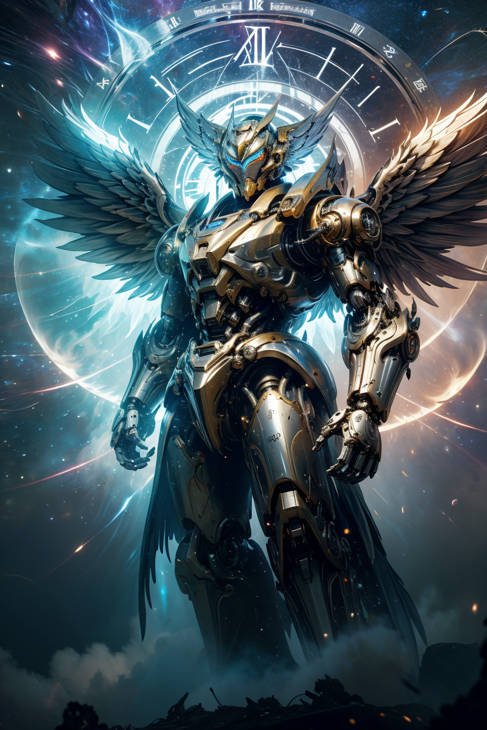 masterpiece,best quality,detailed,high definition,vibrant colors,top quality,best quality,8k wallpaper, from_below,panorama,standing,((universe)),giant robot, glowing eyes,white armor,mechanical halo,mechanical wings,large wings,clock wings,glowing wings,dreamlike,mysterious,symbolic,detailed,mechanical mask, <lora:ChronomancyMecha:0.8>,mecha,