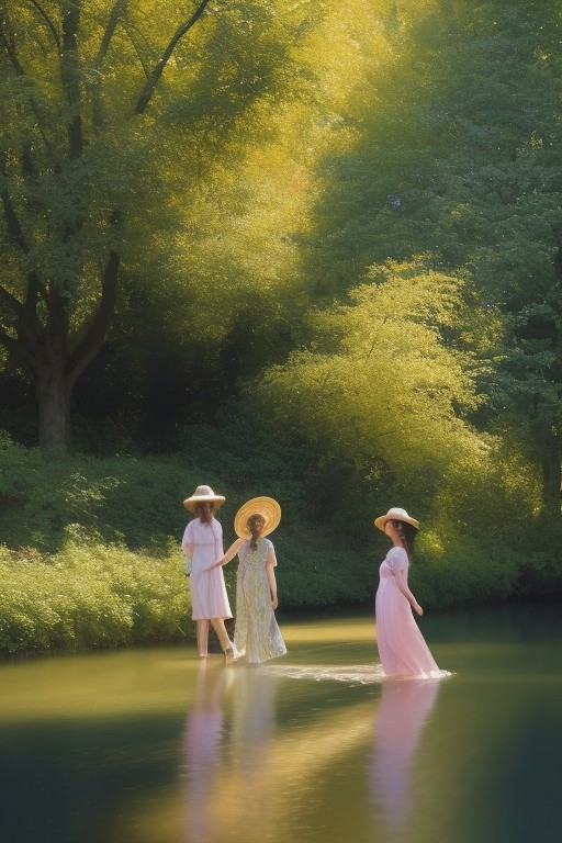 A mesmerizing, ultra-detailed depiction of Impressionist Impressions, where reality blurs into a dreamlike world of soft, expressive brushstrokes and radiant light. The scene captures a golden afternoon in a picturesque Parisian park, where figures seem to shimmer and dissolve into swirling colors—hints of motion captured in fleeting moments, just as an Impressionist master would paint. At the heart of the image, a woman in a flowing pastel dress and a wide-brimmed hat stands near a tranquil pond, her form subtly blending with the luminous dabs of color around her. The water reflects the sky in rippling blues, purples, and warm oranges, with each brushstroke conveying movement and emotion rather than rigid detail. Elegant figures stroll along flower-lined paths, their faces softened into glowing halos of golden light, engaged in hushed conversations or enjoying a peaceful moment beneath the shade of grand, leafy trees