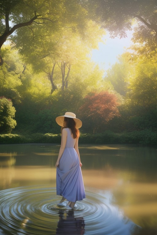 A mesmerizing, ultra-detailed depiction of Impressionist Impressions, where reality blurs into a dreamlike world of soft, expressive brushstrokes and radiant light. The scene captures a golden afternoon in a picturesque Parisian park, where figures seem to shimmer and dissolve into swirling colors—hints of motion captured in fleeting moments, just as an Impressionist master would paint. At the heart of the image, a woman in a flowing pastel dress and a wide-brimmed hat stands near a tranquil pond, her form subtly blending with the luminous dabs of color around her. The water reflects the sky in rippling blues, purples, and warm oranges, with each brushstroke conveying movement and emotion rather than rigid detail. Elegant figures stroll along flower-lined paths, their faces softened into glowing halos of golden light, engaged in hushed conversations or enjoying a peaceful moment beneath the shade of grand, leafy trees