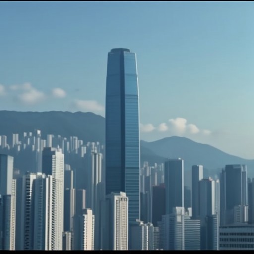 tall, narrow, tower, dystopian, black, Hong Kong, billboards, air conditioning units, short buildings around the main building, 2000s footage, nostalgic, vhs filter, construction, mountains in the background, vhs, clear