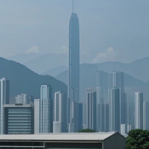 tall, narrow, tower, dystopian, black, Hong Kong, billboards, air conditioning units, short buildings around the main building, 2000s footage, nostalgic, vhs filter, construction, mountains in the background, vhs, clear