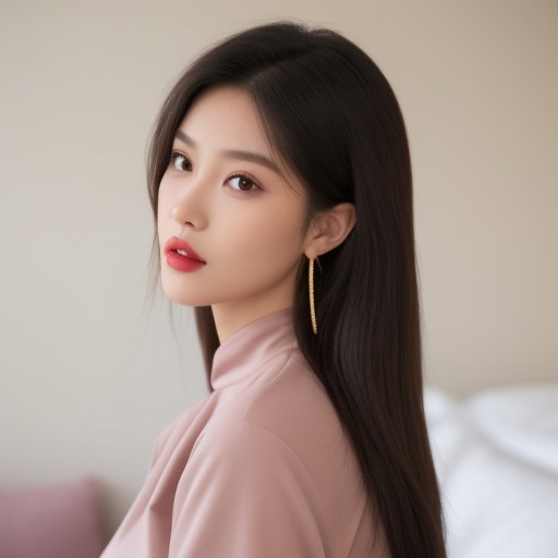 Photorealistic, photo realistic, southeast Asian, Asian, form-fitting clothing, long-sleeved clothing, high-neck clothing, latex shirt, brown shirt, taupe shirt, perky breasts, full breasts, big breasts, large earrings, hoop earrings, full lips, pink lipstick, arched eyebrows, oval-shaped face, high cheekbones, dark brown eyes, soft tan skin, long hair, sleek hair, parted hair, black hair, looking at viewer, close up shot, close up, bedroom, sitting on bed, neutral expression