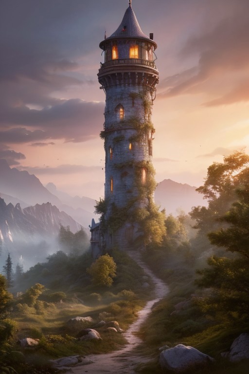 realistic analog photo, award winning photo, vary wide shot of magic stone witow tower:1.3, (Military watchtower), scenery, fantasy, peak, dirt road, nature, outdoors, RAW, highres, 8k, uhd, High Dynamic Range, tonemapping, crisp details,
