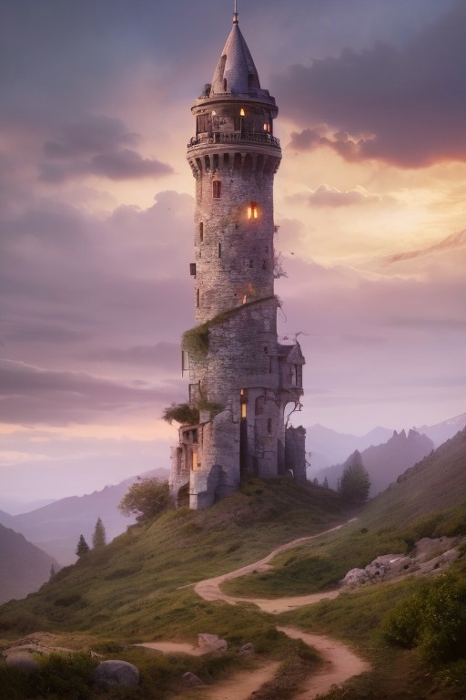 realistic analog photo, award winning photo, vary wide shot of magic stone witow tower:1.3, (Military watchtower), scenery, fantasy, peak, dirt road, nature, outdoors, RAW, highres, 8k, uhd, High Dynamic Range, tonemapping, crisp details,