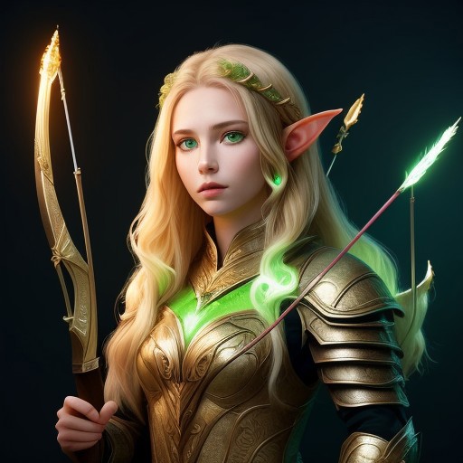 DonM3lv3s, masterpiece, best quality, 8k, symmetrical, 1girl, elf warrior, green eyes, blonde hair, armor, archer, magical clothes, stern look, intimidating, holding golden bow, holding bow, magical arrow, blue glowing arrows, simple background, dark background