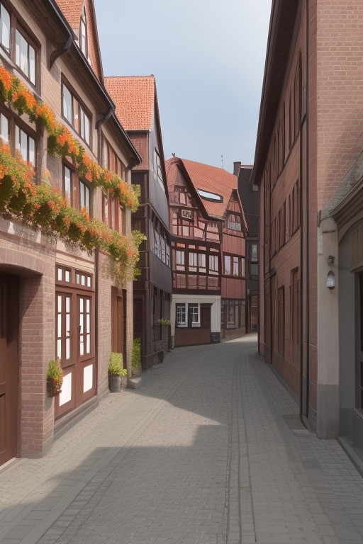 north german downtown, brick walls, red brick, aged brick, grey cobblestone, historic buildings, alley, storefront, very detailed, sunny day