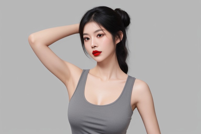 This is a high-resolution photograph of a young, slender East Asian woman with fair skin, straight black hair tied back, and striking red lipstick. She is wearing a tight, light gray tank top that accentuates her big breasts and toned physique.