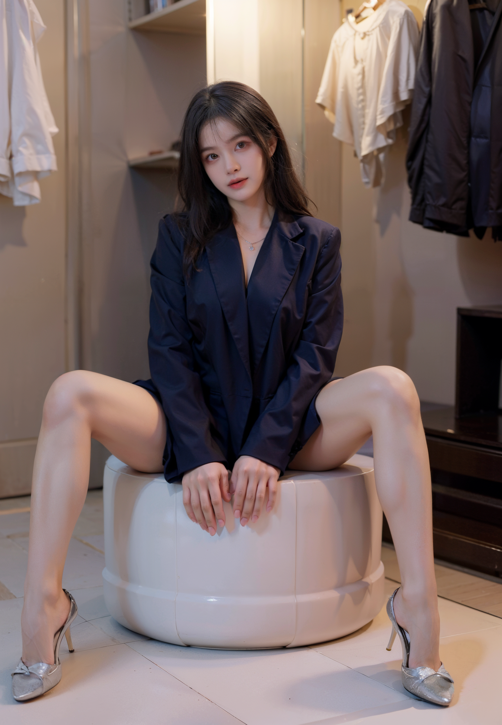 ((blue official suit, cleavage, high heels, wearing necklace, spread legs)), changing room, ((bright theme)),(masterpiece),((ultra-detailed)), (highly detailed CG illustration),(expressionless), (best quality:1.2),(1girl:1.2),High quality texture, intricate details, detailed texture, High quality shadow, brown eye pupil, depth of field, perspective,20s, (big eyes:1.2),blush,perfect body, lean body, (narrow waist:1.3), large breast, distinct_image, (lustrous skin), solo focus, (brown hair), (streaked hair), ((long hair)), <lora:add_detail:0.5>, <lora:GoodHands-vanilla:0.8>, <lora:FilmVelvia3:0.5>, <lora:abelå¯ç±çç¾:0.50>, <lora:LingYi_V1:0.5>, <lora:detailed_notrigger:0.7>, <lora:picxer_real:0.7>, <lora:backlight_slider_v10:-0.5>
