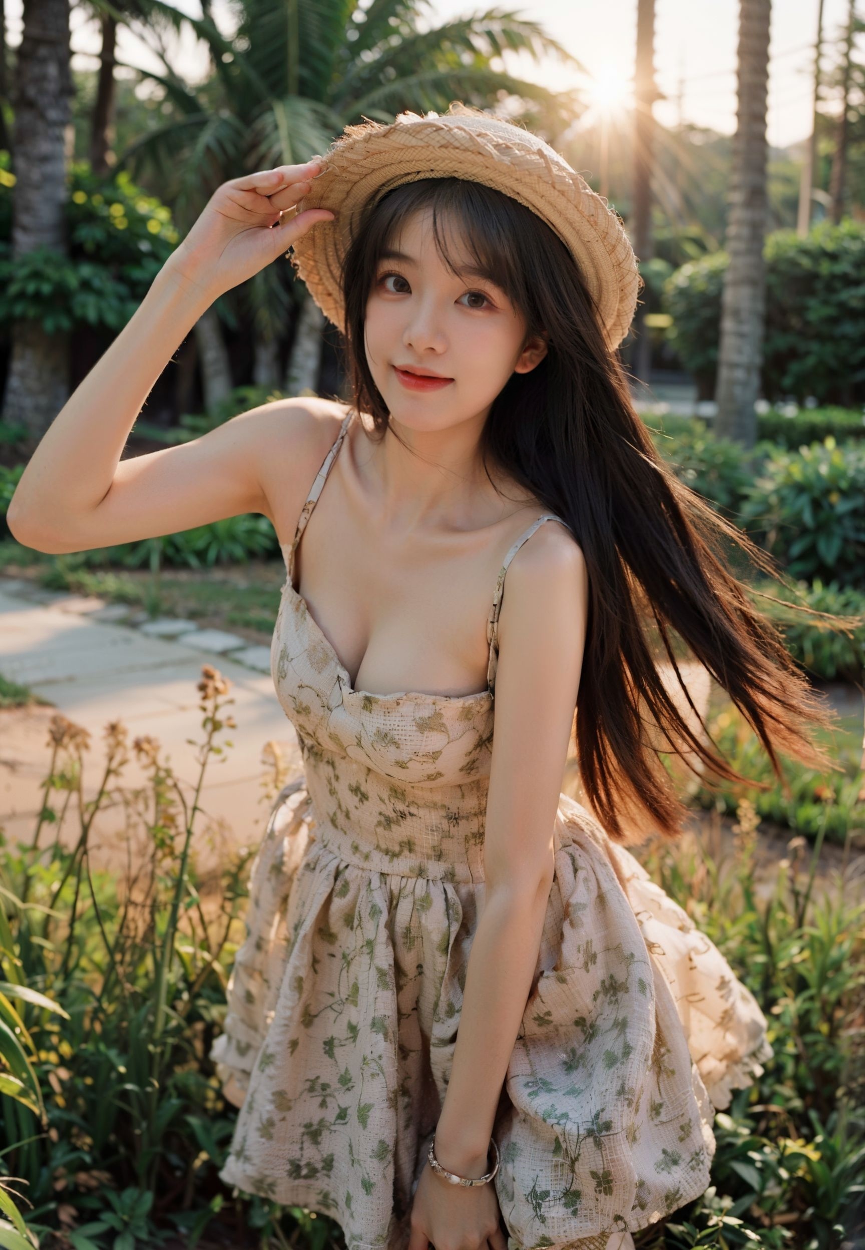 ((backlight)), ((smile, white dress, bare shoulders, cleavage, wearing a straw hat, bentover)), park,floating hair, surrounding by grass, ((bright theme)),(masterpiece),((ultra-detailed)), (highly detailed CG illustration),(expressionless), (best quality:1.2),(1girl:1.2),High quality texture, intricate details, detailed texture, High quality shadow, brown eye pupil, depth of field, perspective,20s, (big eyes:1.2),blush,perfect body, lean body, (narrow waist:1.3), large breast, distinct_image, (lustrous skin), solo focus, (brown hair), (streaked hair), ((long hair)), <lora:add_detail:0.5>, <lora:GoodHands-vanilla:0.8>, <lora:FilmVelvia3:0.5>, <lora:abel可爱甜美:0.50>, <lora:LingYi_V1:0.5>, <lora:detailed_notrigger:0.7>, <lora:picxer_real:0.7>, <lora:backlight_slider_v10:-0.5>
