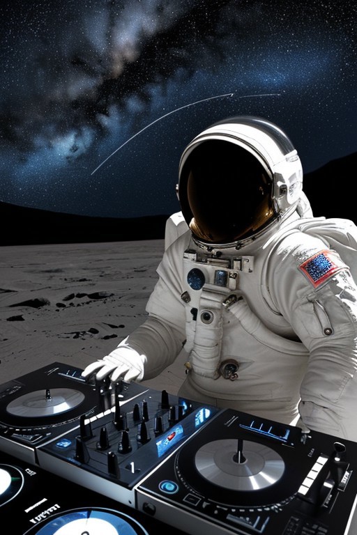 This is a stylized black and white illustration of an astronaut in space. The astronaut is wearing a spacesuit with a helmet, which has reflective visors showing the stars. The suit includes intricate details such as gloves, communication devices on the shoulders, and a camera attached to the chest. In front of the astronaut are two DJ turntables and a mixer. The astronaut's hands appear to be operating the equipment, suggesting that they are engaged in some form of music mixing or DJing. This creates a unique blend of space exploration and musical creativity within the same visual theme. The background features a starry sky, enhancing the cosmic atmosphere. The overall design combines elements from science fiction and modern culture, creating an imaginative scene where the boundaries between different realms are creatively merged.