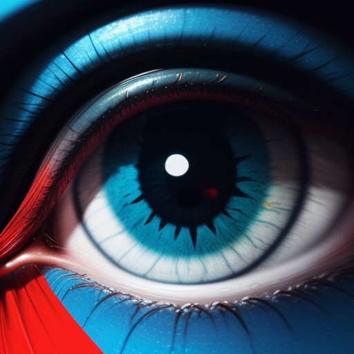 vdsur, surreal, colorful background, blue theme, close-up, eye, reflection, eye focus, castle, red banner, high contrast, best quality, hires